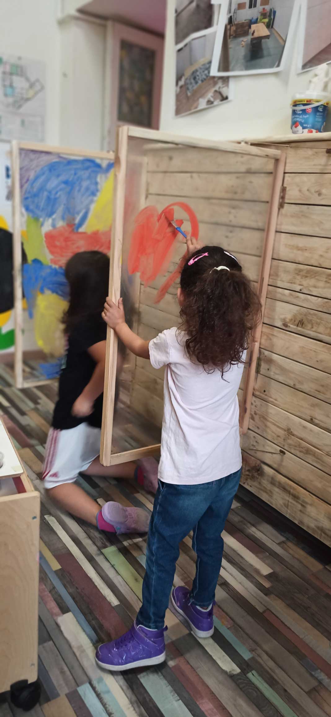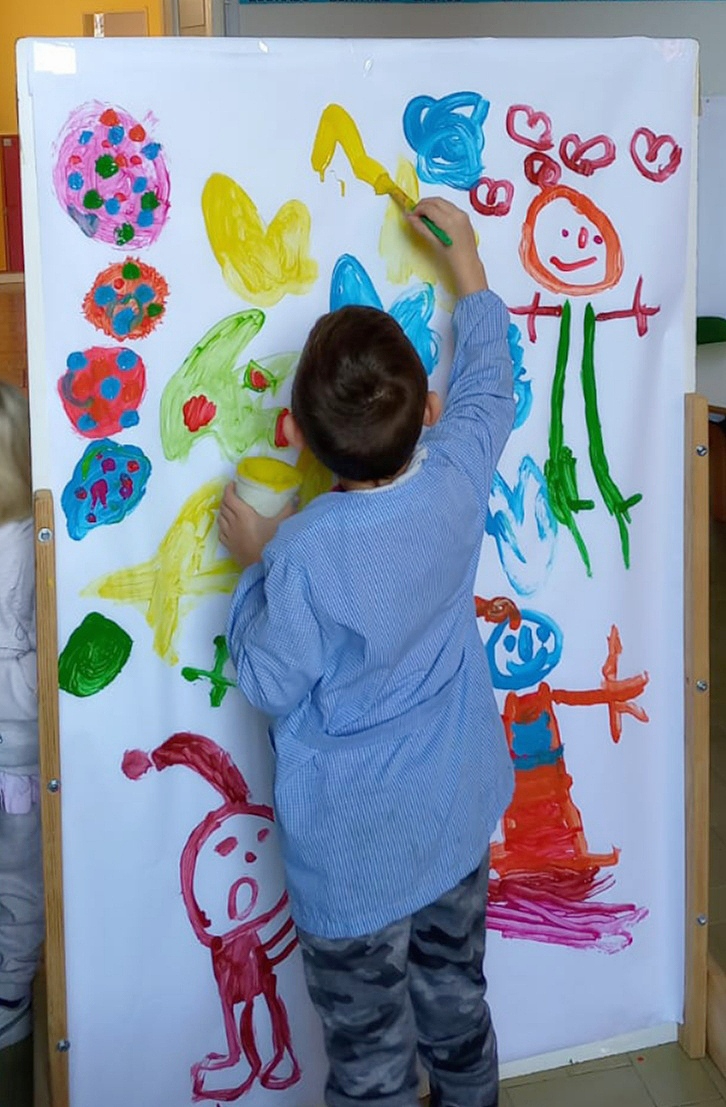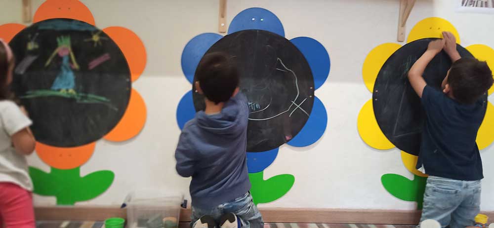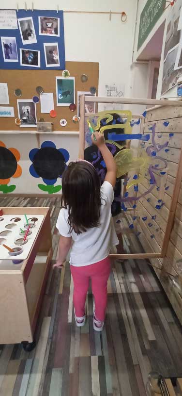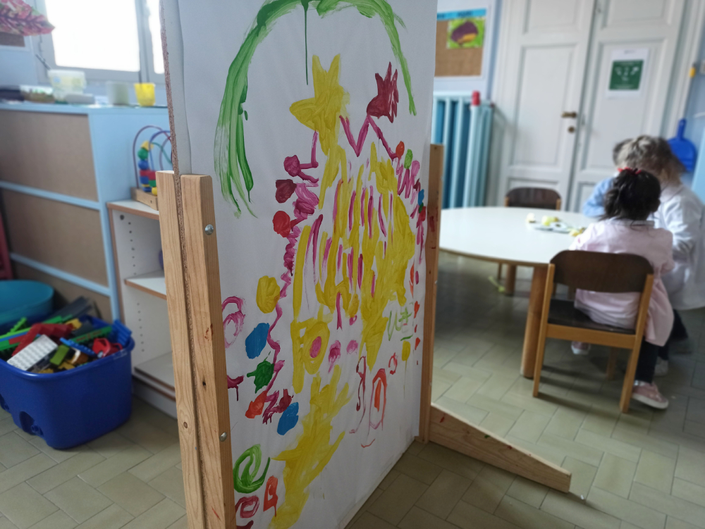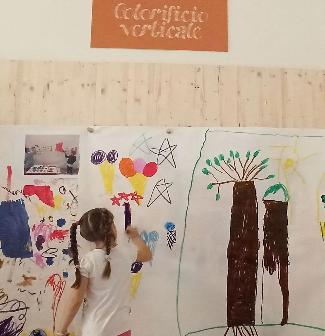 Nel primo i bambini e le bambine possono colorare in verticale su diversi supporti (carta, grafite e pannelli trasparenti) con tempere, acquerelli, pennarelli, gessi e matite colorate.