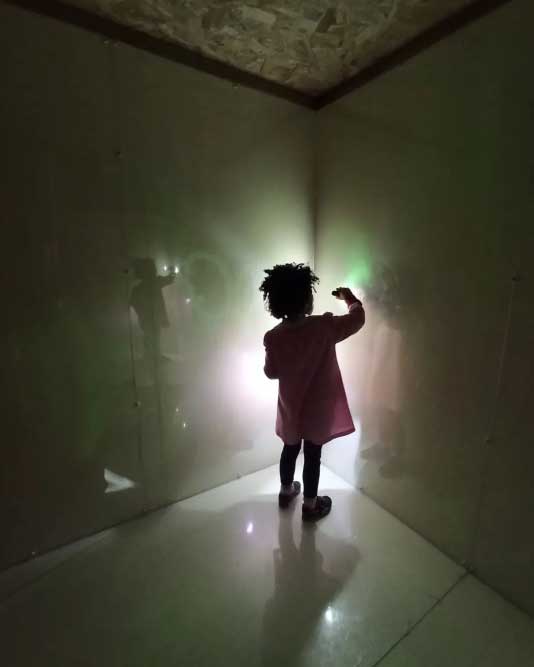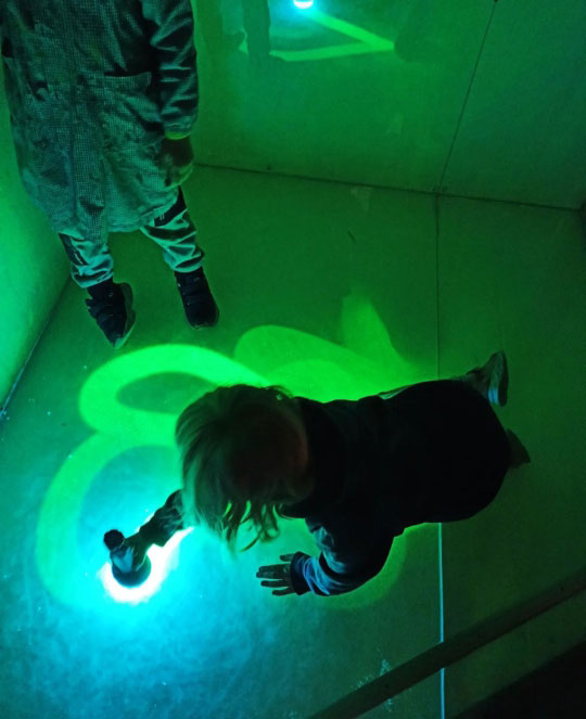 Una parte del Laboratorio Della Luce è dedicata all’Improntificio, una tana in legno con effetti di pittura fosforescente in cui imprimere la propria sagoma corporea attraverso l’utilizzo delle torce.