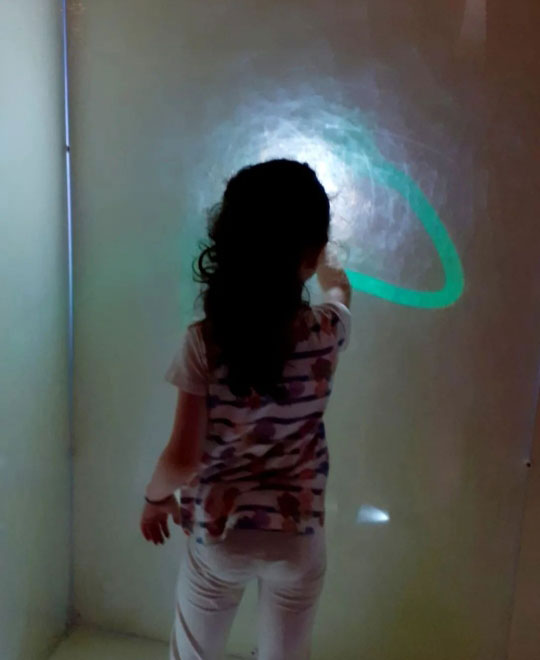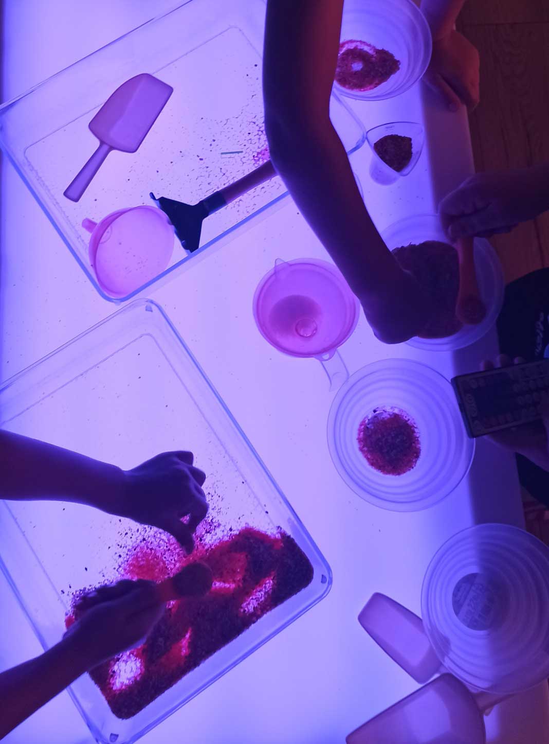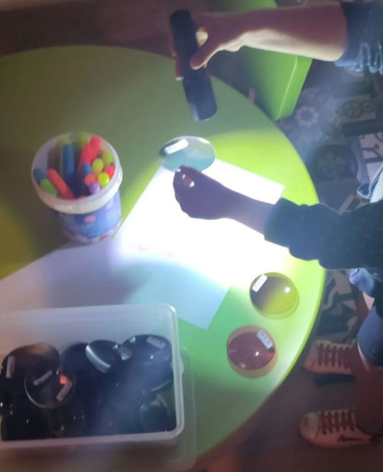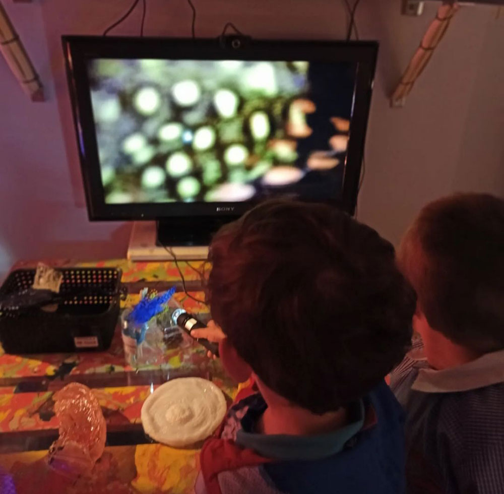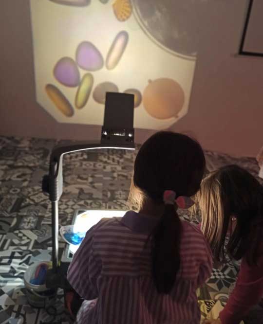 Nel secondo esplorano la luce e le sue diverse forme attraverso il tavolo luminoso, la lavagna luminosa, i microscopi, le lenti di ingrandimento, il proiettore e le torce.